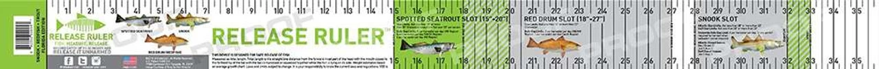 The Florida Inshore Slam Release Ruler for measuring Snook, Redfish and Spotted Trout. The ruler is made from a durable waterproof PVC coated vinyl which is boat friendly and will not bang or ding your boat. This vinyl ruler is easily stowed. Kayak fisherman love the portability of this ruler. This ruler comes with the option to fold its nose bracket for accurate measurements. Clearly marked slot measurements, current regulations and bag limit details are included on this ruler.