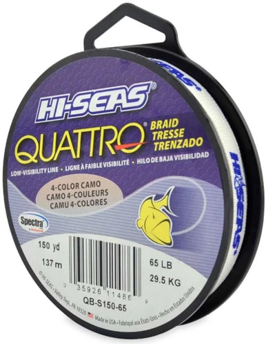 Quattro Braid camouflage fishing line provides excellent performance while retaining all the qualities that anglers have come to love, especially its ability to disappear underwater due to the extreme low-vis scientifically proven 4-color combination of blue, black, green and red, patterned in short random lengths. Quattro Braid does for fishing line what camouflage clothes do for a hunter – it breaks up visual patterns so it blends into the background. Its unique formulation gives it incredible linear and impact strength with excellent abrasion resistance. Made with the finest Spectra fibers and manufactured using a process that weaves it into the tightest braid pattern possible, this remarkable new line is guaranteed to perform like no other.