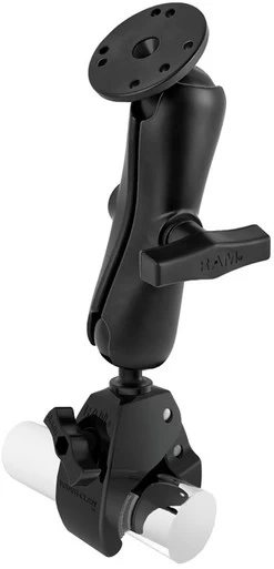 The RAP-401-202U consists of the large Tough-Claw; base, double socket arm and round base adapter. The RAM Tough-Claw: is the perfect mounting base for quick and easy tool-less installation and removal on round, square, odd shaped rails and bars. The Tough-Claw; can be clamped on rails from 1″ – 2.25″ outer diameter. The round base adapter contains the industry standard universal AMPS hole pattern, which will connect to a large variety of RAM Mount and third party cradles. The mount is designed with a RAM 1.5″ diameter patented rubber ball and socket system that has adjustment points at both ends of the double socket arm; this allowing for almost infinite adjustment and perfect viewing angles.