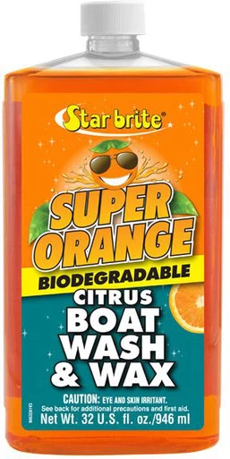 Star Brite Super Orange Citrus Boat Wash & Wax washes, shines, and protects in one easy step with a citrus extract formula that whisks away dirt, grease, and oil. Perfect for fiberglass, metal, or painted surfaces, this citrus extract formula is tough on dirt but gentle to the surface being cleaned. Left behind is a long lasting polymer shine that can help protect your investment from the elements. This fully biodegradable cleaner leaves a long lasting polymer shine and is non-harmful to the environment.